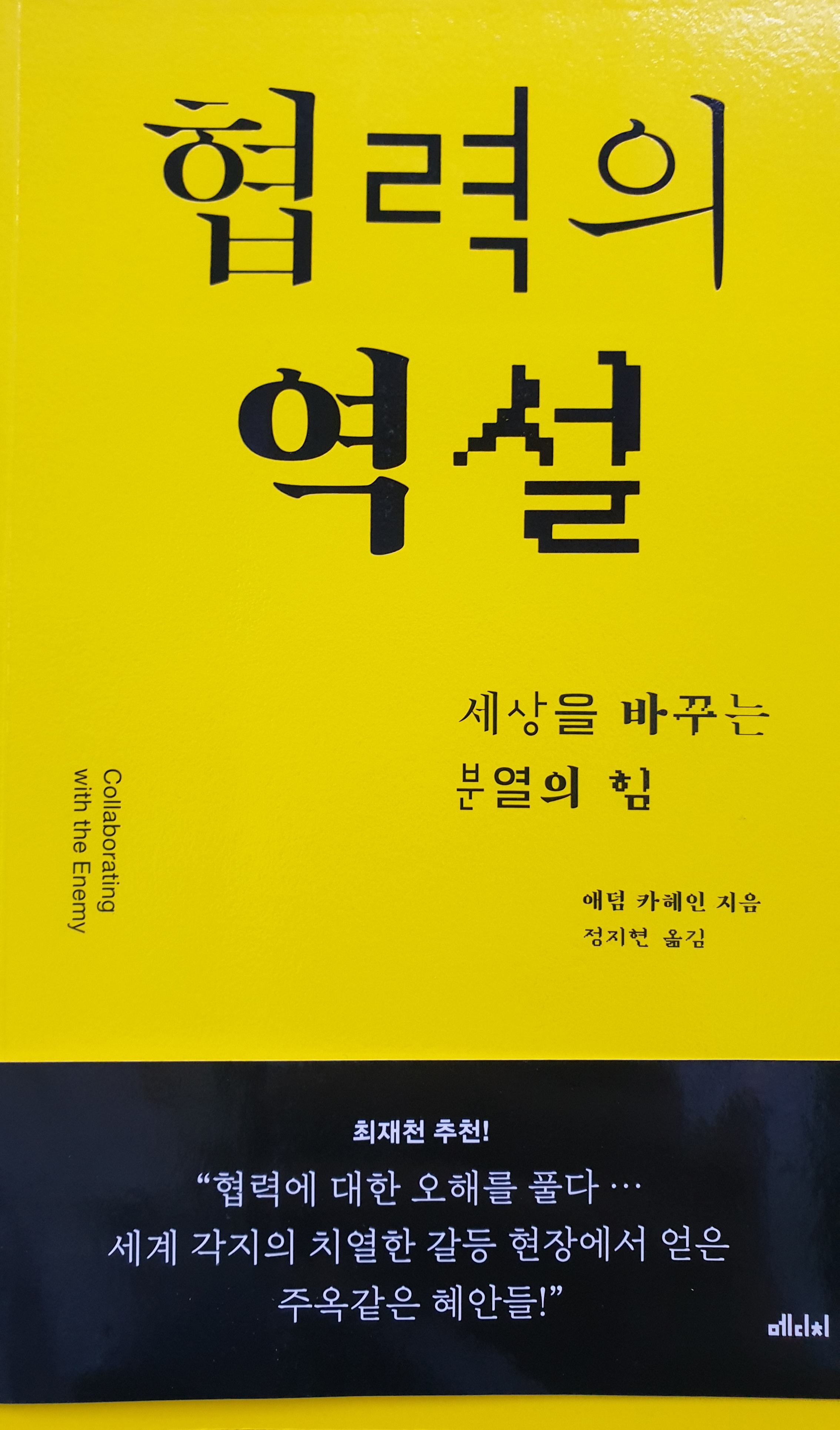 '나는소통과 협력이 잘되는 조직을 본 적이 없다. 오랜 고민 끝에 그 이유를 찾았다. 원래 소통과 협력은 안 되는게 지극히 정상이기 때문이다. 소통과 협력에는 어떤 형태로든 자기 희생이 수반된다. 스스로 자기 생명의 주인이라고 생각하는 독립적 생명체로서 희생은 애당초 쉽지 않은 일이다. (중략) 카헤인은 이 책에서 대화가 전부가 아니라고 단언한다. 협력에는 배려와 참여 못지않게 원칙에 입각한 주장도 필요하다는 사실을 일깨워준다. 우리가 협력이 어렵다고 느끼는 이유는 협력의 본질을 오해했기 때문이다. 그동안 우리가 협력을 하기 위해 가졌던 모임은 대체로 전략 회의와 흡사했다. 이는 협력을 너무 성급하게 공동 작업의 단계로 옮겨 놓았기 때문에 일어난다. (중략) "문제의 일부가 아닌 사람은 해결책도 없다"는 이 책의 메시지를 곱씹어보자. (중략) 토론은 누가 옳은가가 아니라 무엇이 옳은가를 찾는 행위다. 그리고 무엇이 옳은가를 찾기 위해서는 때로 상대가 아니라 내가 먼저 바뀌어야 하는 상황이 올 수도 있다는 사실을 받아들여야 한다.' -최재천 교수님의 추천의 글 중에서